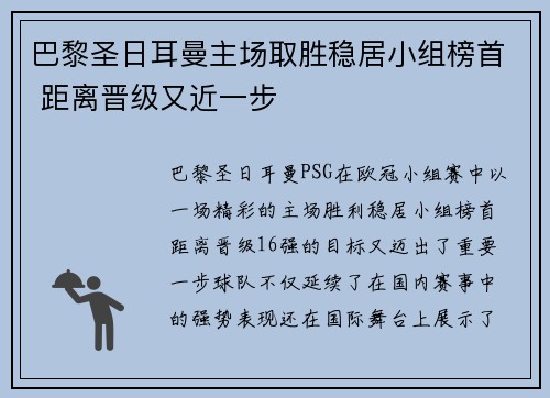 巴黎圣日耳曼(PSG)在欧冠小组赛中以一场精彩的主场胜利稳居小组榜首,距离晋级16强的目标又迈出了重要一步。球队不仅延续了在国内赛事中的强势表现,还在国际舞台上展示了强大的竞争力。本文将从四个方面详细分析巴黎圣日耳曼主场取胜的重要性,并阐述...