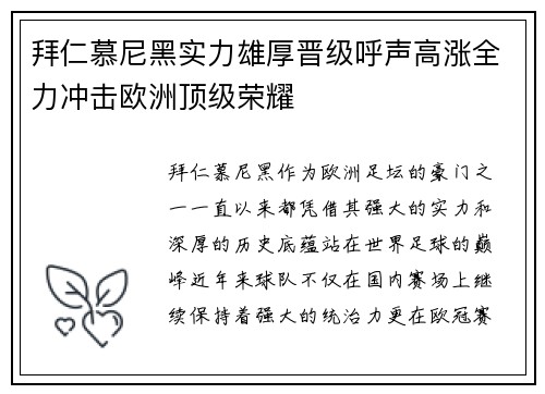 拜仁慕尼黑作为欧洲足坛的豪门之一,一直以来都凭借其强大的实力和深厚的历史底蕴,站在世界足球的巅峰。近年来,球队不仅在国内赛场上继续保持着强大的统治力,更在欧冠赛场上展现了其不容忽视的竞争力。2024赛季,拜仁慕尼黑的实力雄厚,晋级的呼声一度...
