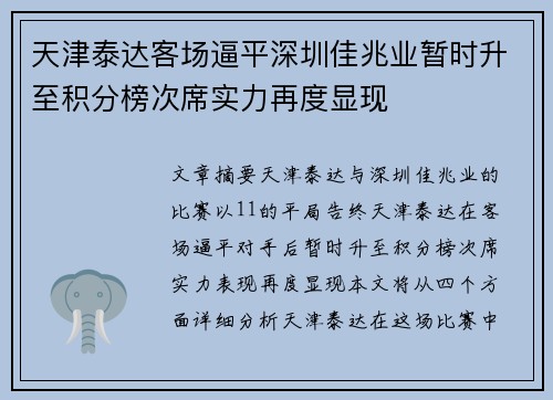 文章摘要:天津泰达与深圳佳兆业的比赛以1-1的平局告终,天津泰达在客场逼平对手后,暂时升至积分榜次席,实力表现再度显现。本文将从四个方面详细分析天津泰达在这场比赛中的表现,阐述他们如何在激烈的竞争中脱颖而出。首先,文章将探讨天津泰达本场比赛...